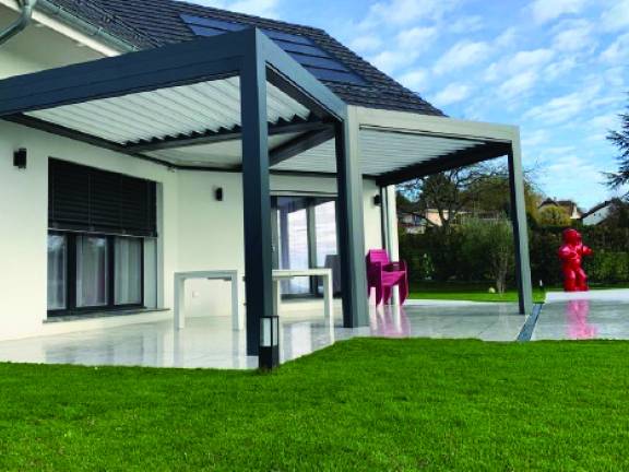 Modell 600: Die Pergola mit drehbaren Lamellen ist unter einem Bogen aufgehängt. Max.